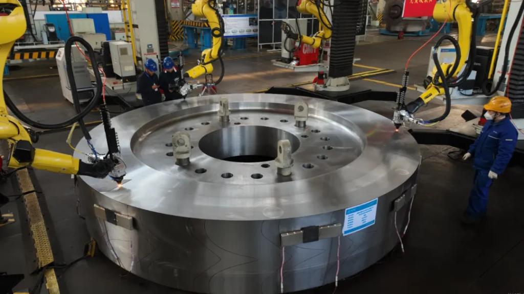 在转轮的工艺制造上,采用机器人电弧增材制造(3D打印)技术,“打印”完成后,大圆环就会“长”出一片片水斗型“花瓣”,这道程序就是所谓的“铁臂绣花”。“铁臂绣花”不仅降低了锻件制造难度,提高了材料利用率,还可以让转轮应对极端情况。